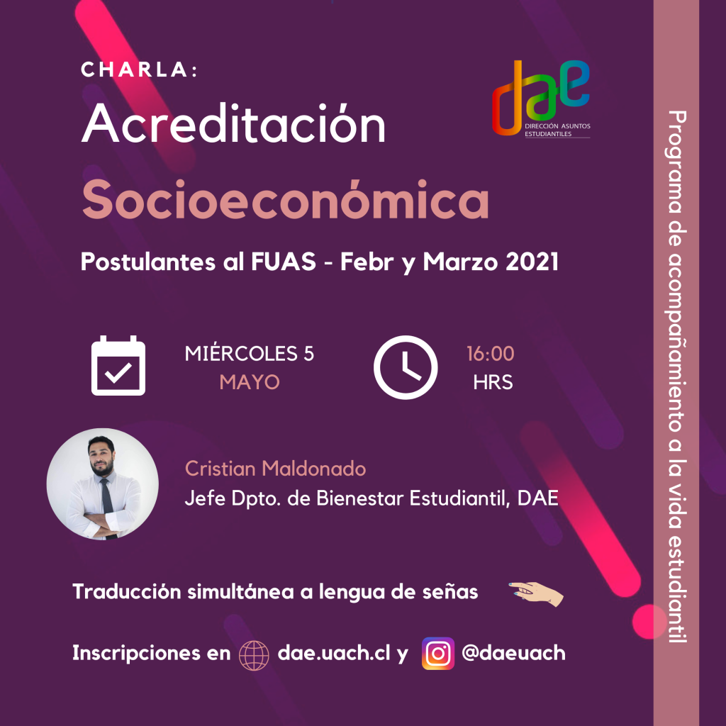 En el marco del Programa de Acompañamiento a la Vida Estudiantil, impulsado por la Dirección de Asuntos Estudiantiles, se realizará la primera charla del año, organizada para la Comunidad Estudiantil. En la instancia se entregará información y se resolverán dudas respecto a la Acreditación Socioeconómica para estudiantes que hayan postulado al Formulario Único de Acreditación Socioeconómica (FUAS), entre febrero y marzo de 2021.
