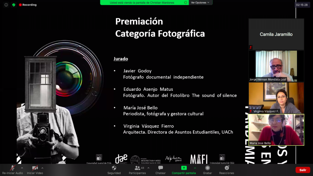 El jurado que participó en la deliberación para la categoría de fotografía, estuvo compuesto por Javier Godoy, fotógrafo documental independiente; Eduardo Asenjo, fotógrafo y autor del Fotolibro The sound of silence; María José Bello, periodista, fotógrafa y gestora cultural; y Virginia Vásquez Fierro, arquitecta y Directora de Asuntos Estudiantiles, UACh.