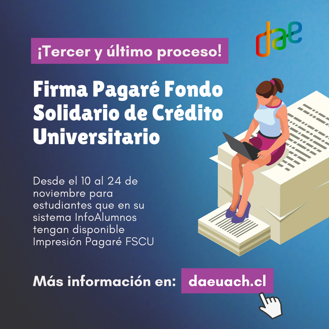 Este jueves 10 de noviembre inicia el tercer y último proceso de Firma Pagaré de Fondo Solidario de Crédito Universitario, el cual será más acotado que los anteriores, finalizando el jueves 24 de noviembre.
