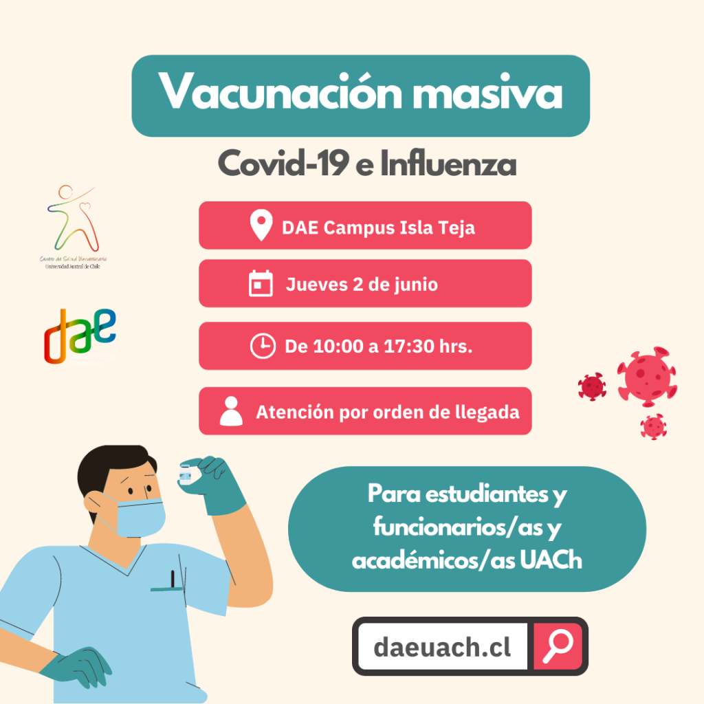 Gracias a la gestión conjunta del Centro de Salud Universitario (CESU) y Centro Médico del Personal UACh, con la colaboración del Servicio de Salud Valdivia, se realizará vacunación masiva contra Influenza y Covid-19 a estudiantes, funcionarios/as y académicos/as de nuestra casa de estudios en las dependencias de la Dirección de Asuntos Estudiantiles del Campus Isla Teja el próximo jueves 2 de junio, desde las 10:00 a las 17:30 horas.