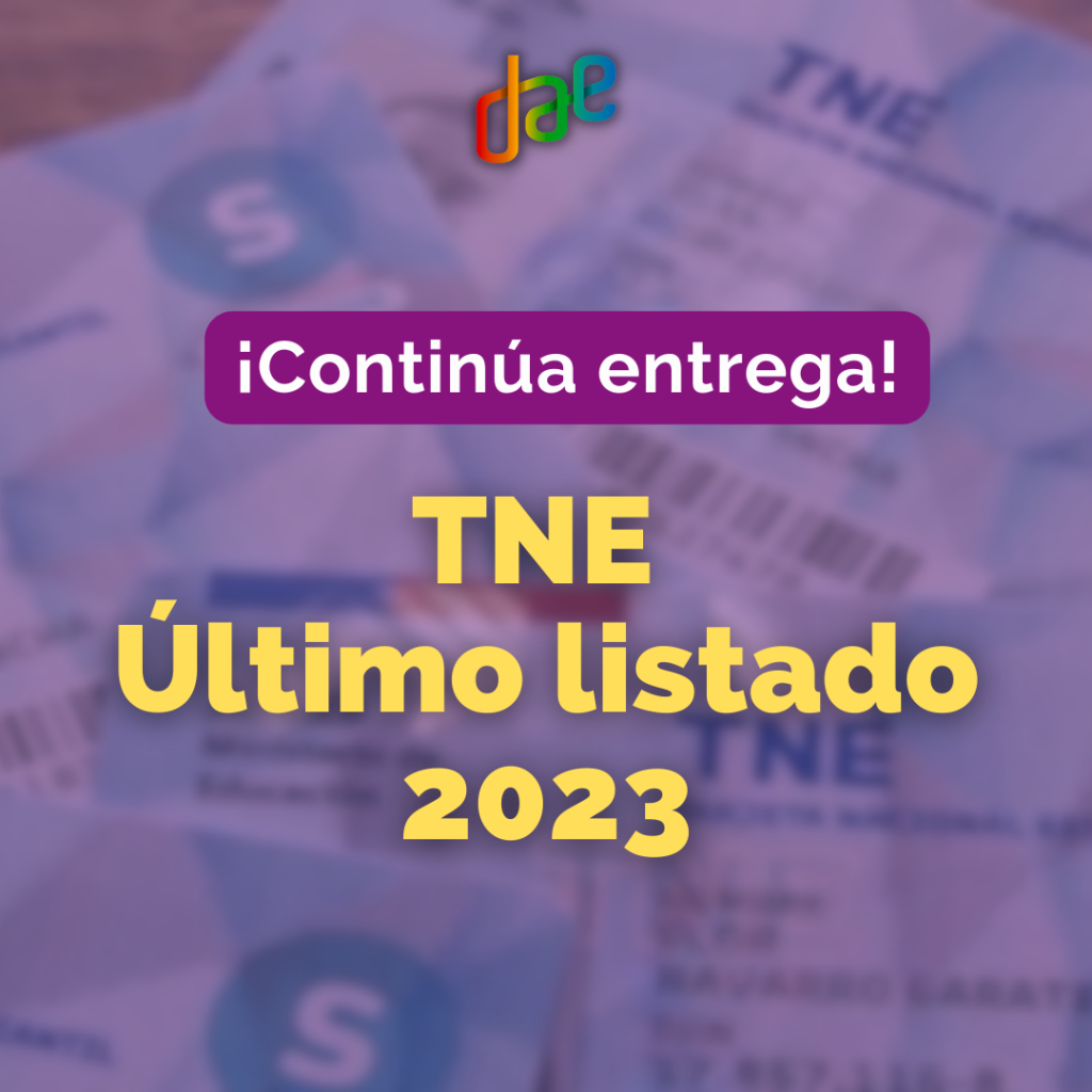 La Dirección de Asuntos Estudiantiles (DAE) continúa con entrega de TNE 2023, las cuales se pueden retirar en DAE Campus Isla Teja y DAE Campus Miraflores, de lunes a viernes las 09:00 a 13:00 hrs. y de 14:30 a 17:00 hrs.